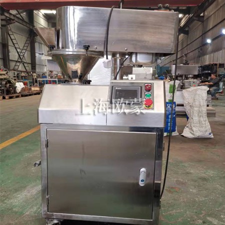 本機(jī)有送料機(jī)構(gòu)、壓片機(jī)構(gòu)、液壓機(jī)構(gòu)、機(jī)架和電氣控制等部件組成,送料,壓片、制粒均采用變頻無(wú)級(jí)調(diào)速,油泵壓力可調(diào),成品細(xì)度可以通過更換不同的篩網(wǎng)獲得。改進(jìn)制粒轉(zhuǎn)籠,增加了顆粒的成品率。本機(jī)裝拆、清洗方便,與物料接觸部分皆為不銹鋼制作。產(chǎn)品符合GMP要求。物料由頂部送料漏斗加入,經(jīng)兩壓輪強(qiáng)制擠壓成片狀后進(jìn)入下部制粒室,在制粒室中片狀物料被制粒刀片打碎,然后進(jìn)入整粒室,直至顆粒小于或等于網(wǎng)孔徑,顆粒通過網(wǎng)篩到盛料托盤。所需要顆粒大小可以通過調(diào)整篩網(wǎng)大小來(lái)決定。